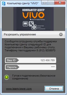 Утилита не требует установки и обеспечивает немедленный доступ к компьютеру через Интернет при помощи специально сгенерированных логина и пароля, которые становятся недействительны сразу после закрытия программы. Сообщите Ваш ID и единовременный пароль сотруднику сервиса Компьютер-Центр "VIVO", который после сеанса связи поменяется.